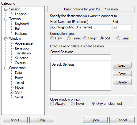 In the Hostname box write ‘ubuntu@’ and your public dns name for the instance from the EC2 dashboard.