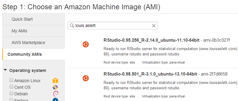 I do pretty much all my analysis in R using RStudio which are both free. It turns out that the open source community, and Louis Aslett in particular, have done a lot of the hard work in getting RStudio to work on an EC2 instance. Louis has created a series of AMIs (Amazon Machine Images) that can be used with RStudio Server. Simply go to the EC2 dashboard, click ‘Launch Instance’ and search for Louis’s AMIs.